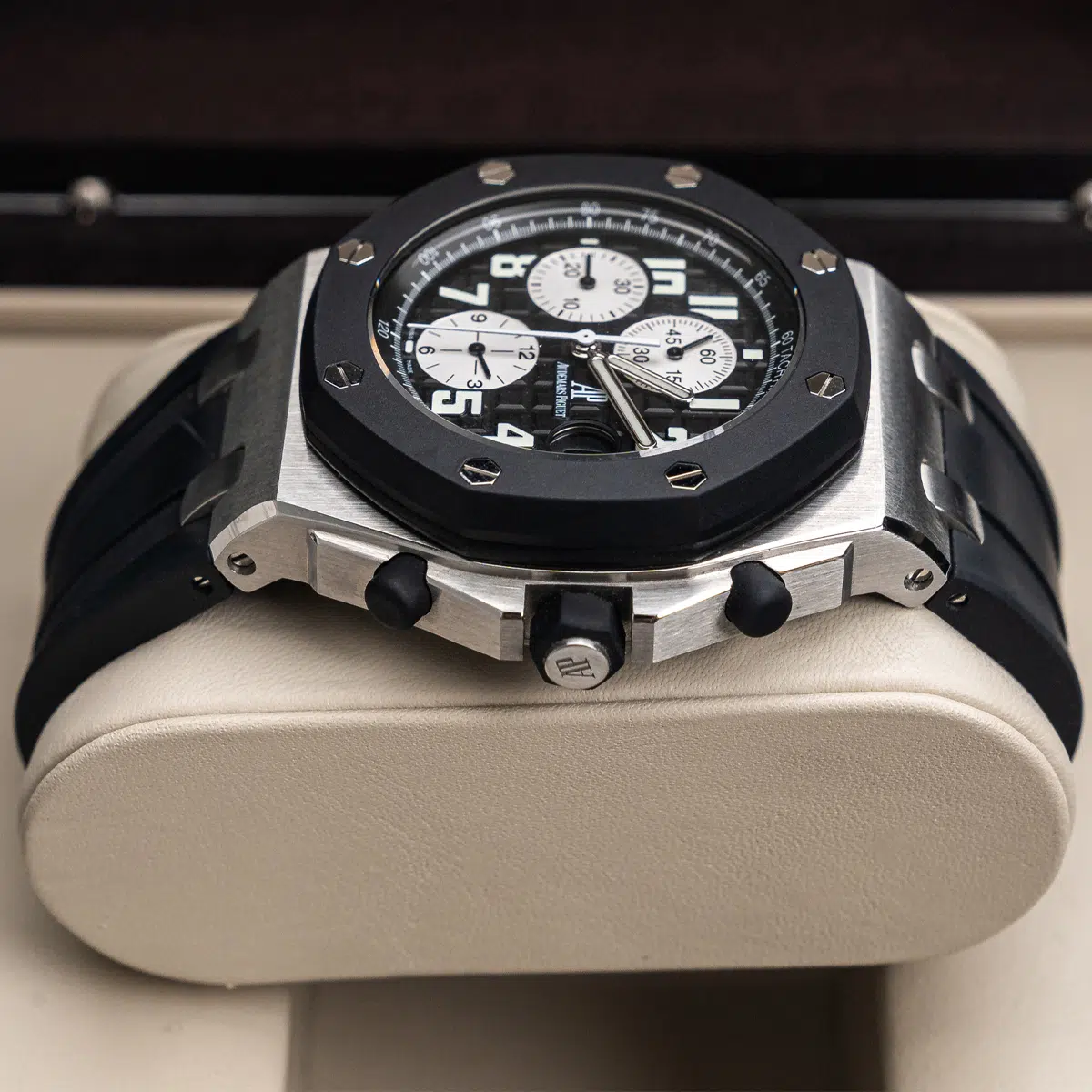 The “Rubberclad” nickname is derived from its most distinctive feature: a bezel seamlessly fused with black rubber inserts. This innovative material contrast elevates the watch’s visual texture while providing enhanced shock resistance and a unique tactile feel. Housed within a imposing 42mm stainless steel case, it retains the beloved Royal Oak DNA with its octagonal bezel secured by eight polished hexagonal screws. The intricate “Grande Tapisserie” pattern on the anthracite black dial provides a stunning, sun-brushed backdrop for the luminescent hands and applied hour markers. The chronograph sub-dials and date window at 3 o’clock offer perfect symmetry and legibility.