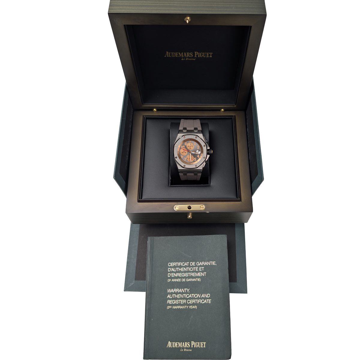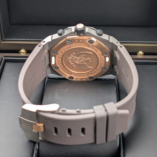 Crafted from solid 18k rose gold, the 42mm case exudes a warm, commanding presence. It retains the Offshore lineage’s robust stature and sculptural complexity, with polished bevels cutting sharply against brushed surfaces. The chronograph pushers, reminiscent of timeless automotive pedals, provide a satisfyingly precise tactile response. Audemars Piguet masterfully pairs this noble metal with a fitted black rubber strap, creating a provocative harmony of luxury and sport. The strap, equipped with the AP-emblazoned rose gold folding clasp, ensures a secure and exceptionally comfortable fit for any occasion.