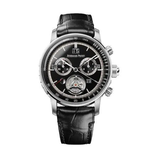 This timepiece is presented on a supple, hand-stitched black alligator leather strap, renowned for its durability and refined texture. It secures with an AP-signed 18k white gold folding clasp, ensuring a seamless and secure fit on the wrist. The strap’s genuine quality and comfort make it ideal for both daily wear and formal occasions, transitioning effortlessly from boardroom to evening engagements.