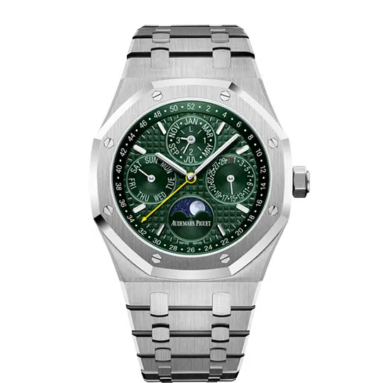 Beneath the iconic “Grande Tapisserie” dial lies a micro-engineering marvel. The self-winding Calibre 5134 orchestrates the perpetual calendar’s exquisite dance, automatically accounting for the varying lengths of months and the leap-year cycle until the year 2100. The moonphase display, a poetic nod to celestial rhythms, boasts astonishing accuracy requiring only a single correction every 122 years. Each sub-dial—for the day, date, month, and leap year—is meticulously arranged in harmony with the Royal Oak’s signature geometry, proving that supreme legibility can coexist with breathtaking complexity.