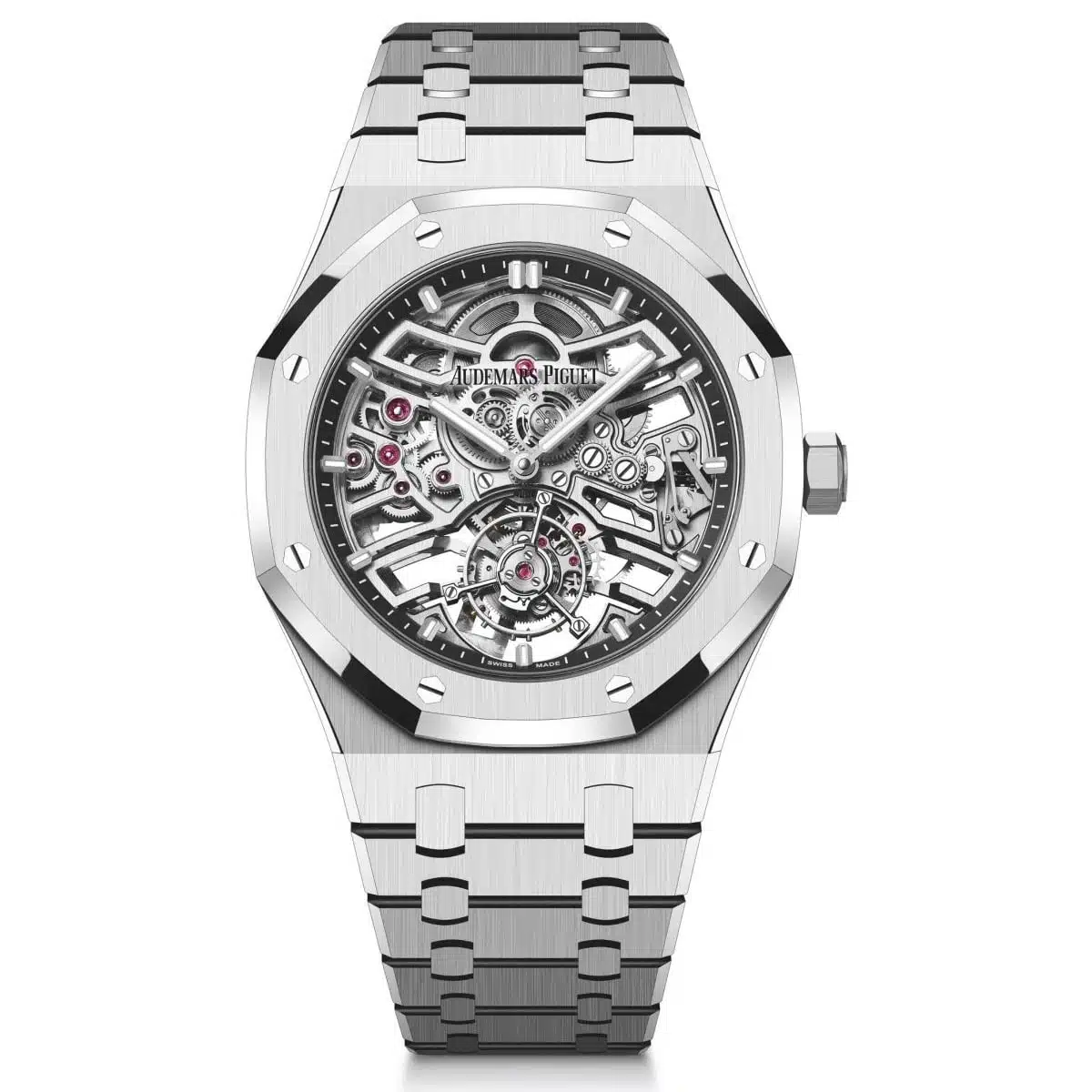The 41mm stainless steel case retains all the Royal Oak’s legendary design codes: the octagonal bezel secured by eight hexagonal white gold screws, the integrated bracelet with its flawless articulation, and the “Grande Tapisserie” dial pattern reinterpreted on the movement’s base. However, here, the dial is reimagined as a series of black-treated gold hour-markers and hands, floating above the mechanical panorama. This creates staggering depth and legibility against the complex backdrop. The flying tourbillon—mounted on a single side, appearing to float at 6 o’clock—completes the visual ballet, its carriage rotating once per minute to counteract the effects of gravity.