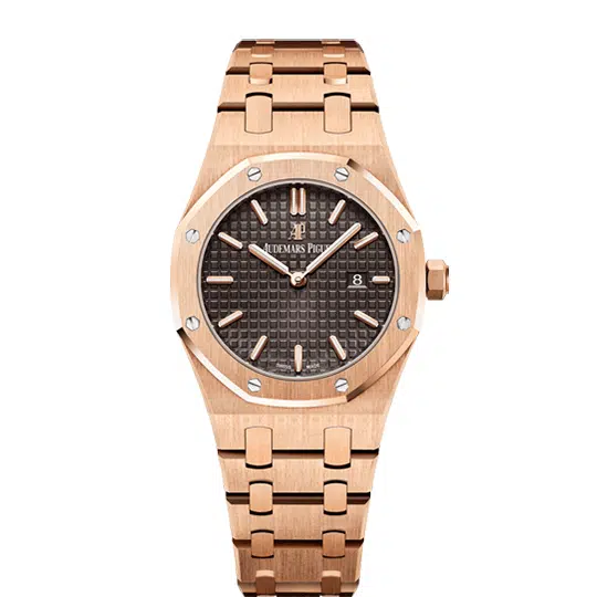 At the heart of this watch is the unmistakable Royal Oak architecture. The 33mm case, meticulously fashioned from solid 18k rose gold, features the signature octagonal bezel secured by eight hexagonal white gold screws. This bold geometric design is polished and satin-brushed by master artisans to a stunning finish that plays with light. The celebrated “Grande Tapisserie” guilloché dial, in a rich silvered tone, provides a textured canvas for the applied rose gold hour-markers and Royal Oak hands. The integrated bracelet, an engineering marvel, flows seamlessly from the case, its links mirroring the case’s alternating polished and brushed surfaces for unparalleled comfort and visual coherence.