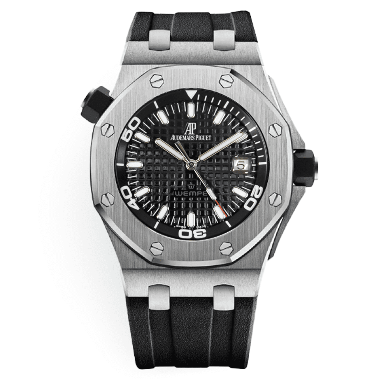 Crafted for presence and durability, the 42mm case is a masterpiece of stainless steel, finished with a distinctive black tonal treatment that adds a modern, stealth-like edge. It retains the Offshore’s signature muscular profile, with its integrated bolt-locked bezel and exposed hexagonal screws paying direct homage to the original’s nautical inspiration. The screw-locked crown and chronograph pushers are thoughtfully oversized, ensuring ease of use and reinforcing the watch’s tool-watch DNA, all while maintaining impeccable finishing.