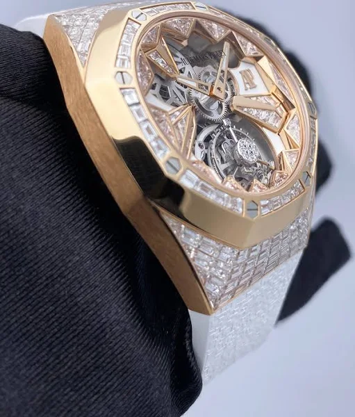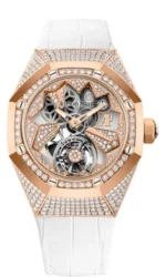 Skeletonised automatic-winding movement with hours, minutes, seconds, date, winding indicator, power-reserve indicator and declutchable variable-geometry rotor. The declutchable rotor works as follow: when the power reserve reaches 50 hours, the rotor is declutched automatically thanks to a specially developed gear system. As a result, the rotor is disengaged from winding the barrel. Conversely, when the power reserve decreases to 40 hours, the rotor is automatically clutched and the watch starts the winding phase until the indicator reaches 50 hours. It is possible to check theses phases thanks to the rewinding indicator located at 12 o’clock. It keeps the user informed whether the rotor is operating in winding phase (on) or is disengaged (off). Typical of Richard Mille, the declutchable rotor is a major innovation with its conception and miniaturization which represents an extraordinary technical challenge.